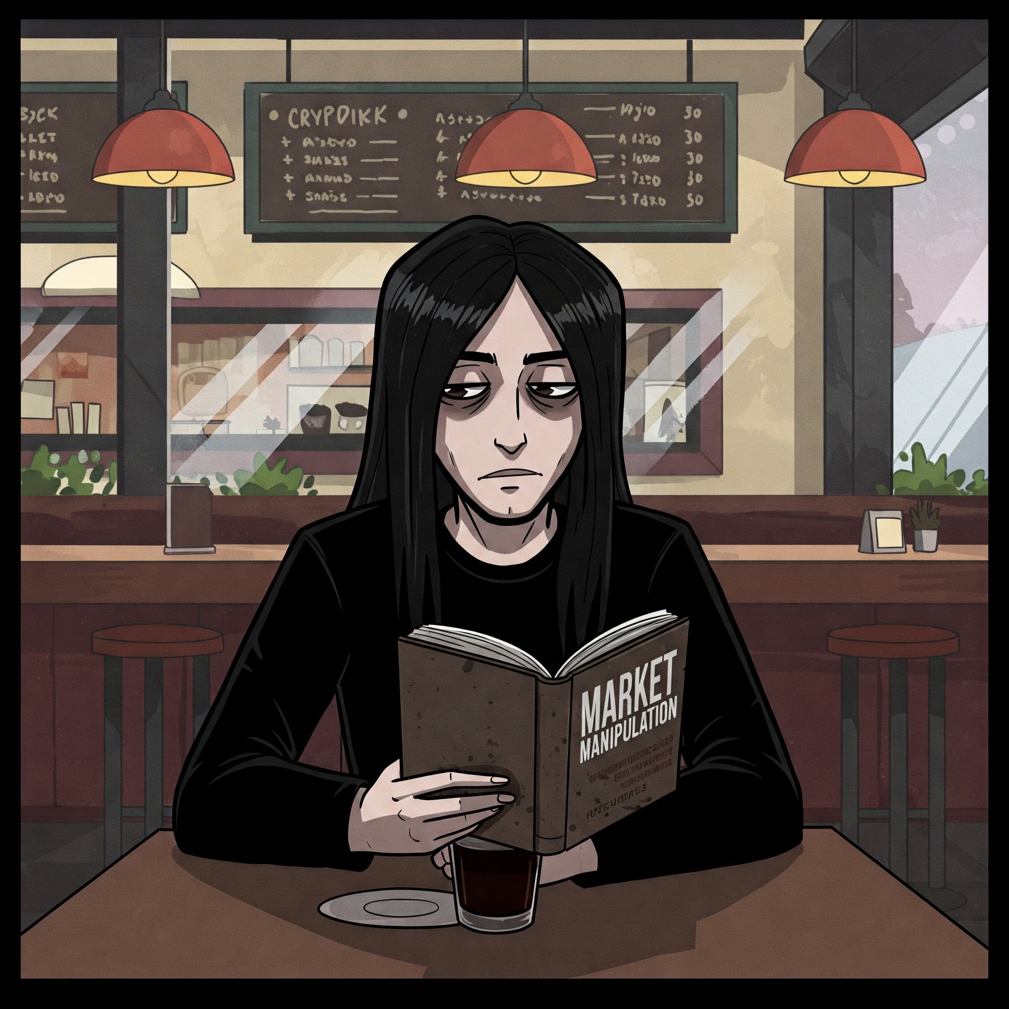 (CrypDikk sips his coffee, glancing back down at his book, the market's manipulations now a point of intellectual curiosity after a morning of active trading.)